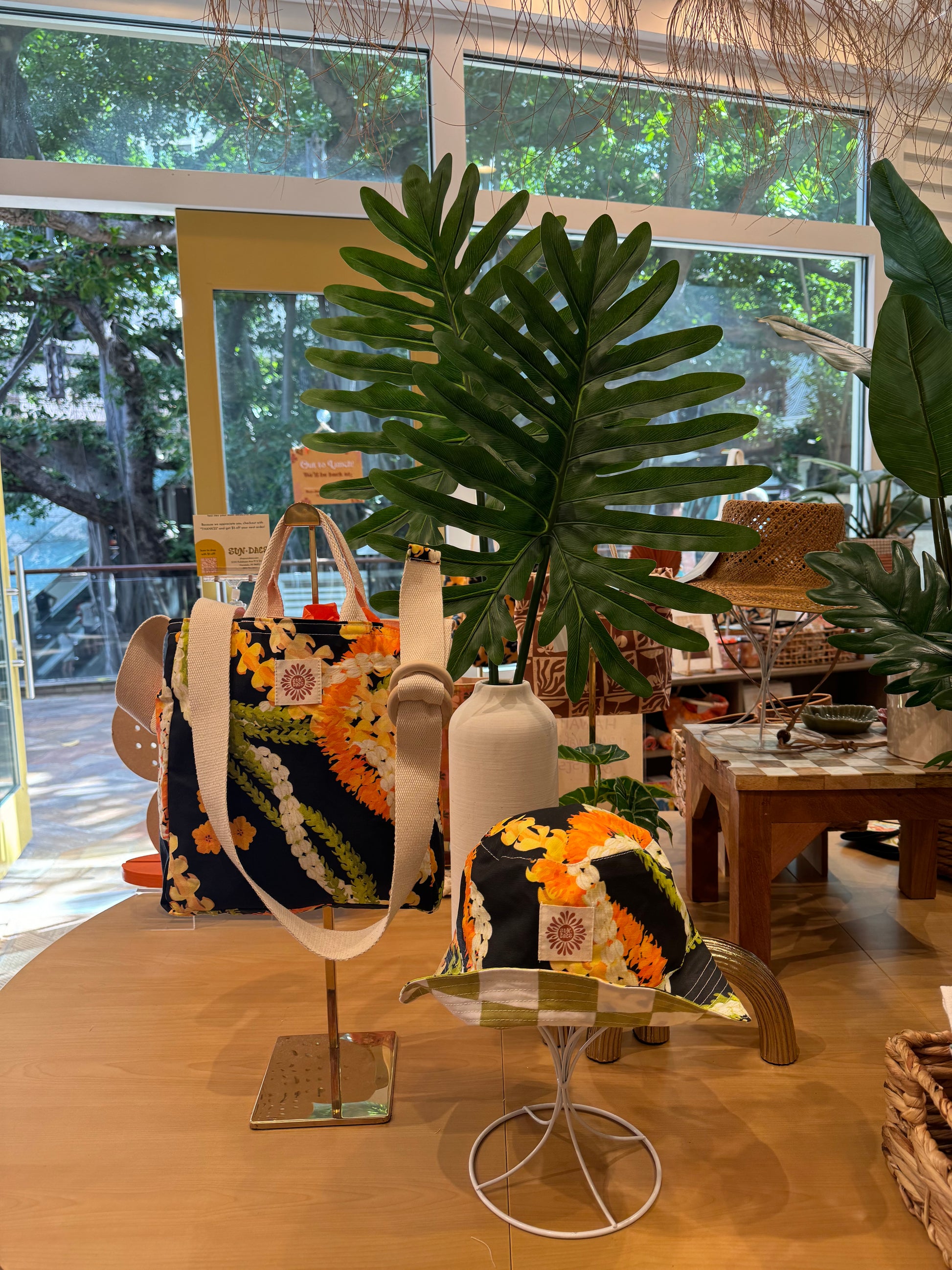 Adjustable crossbody strap with wooden ring. Because these are hand cut each bag will have a different Lei pattern.