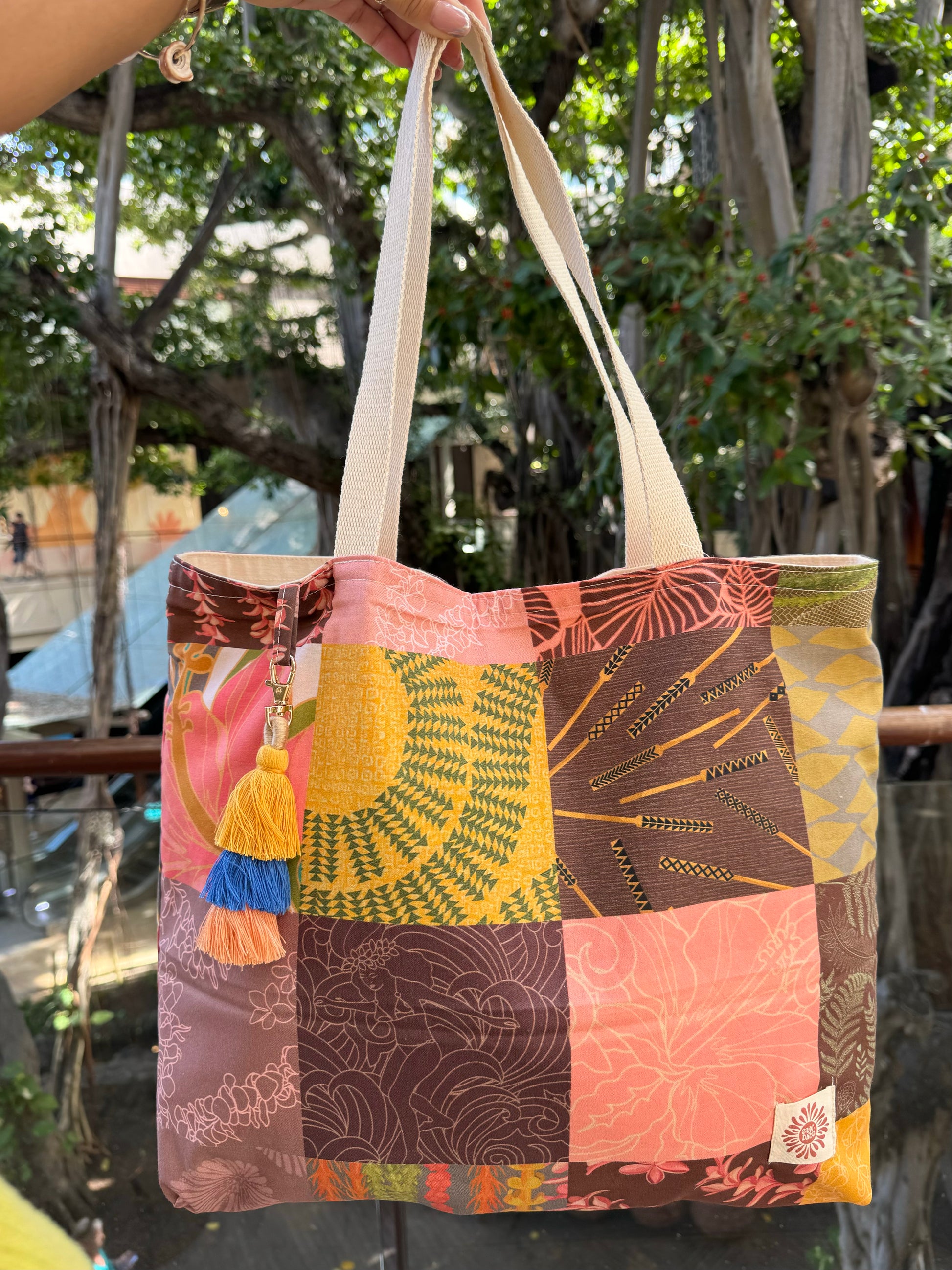This bag is slow made with love! Each bag will come with a different color tassel. Because this is a patchwork bag each one will have a different layout.