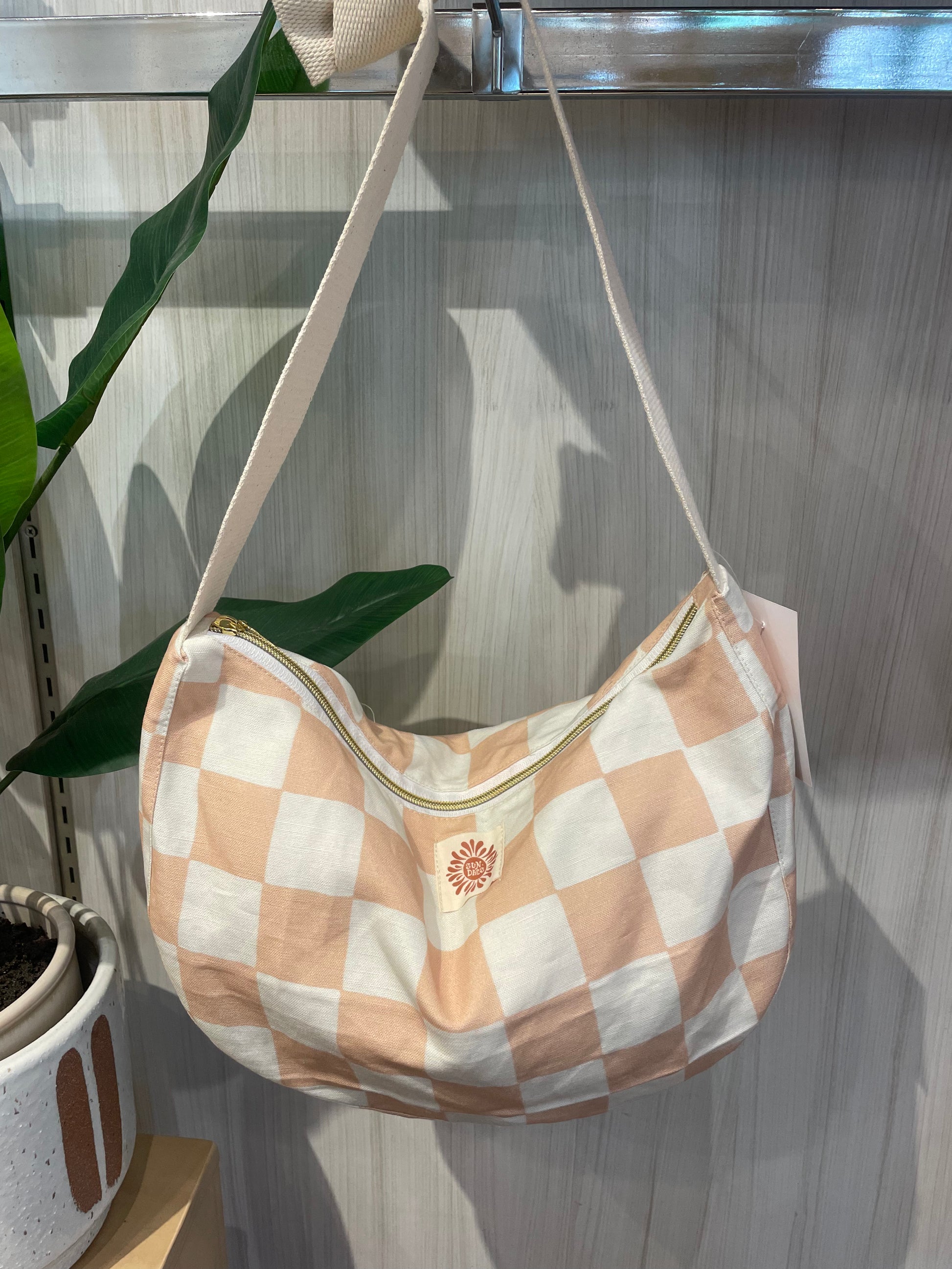 Tan checkered charm crossbody